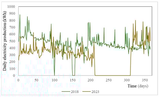 Translating the described turbine capacities into electricity production (Figure 4), the difference between 2018 and 2023 is visible up to the 300th day in 2018. These values were usually higher (daily average for the first 200 days: 2018: 482.18 kWh, 2023: 340.39 kWh), and in the last 60 days, they were higher in 2023 than in 2018 (respectively, 418.30 kWh and 500.28 kWh). Total estimated electricity production based on actual data amounted to 169.43 MWh in 2018 and 99.68 MWh in 2023.