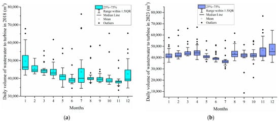 Daily volume of wastewater to the turbine in the hydropower plant at the wastewater treatment plant in Toruń: (a) in 2018, (b) in 2023.