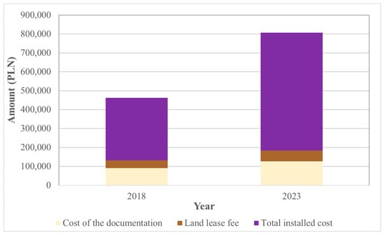 According to the information shown in Figure 6, the total estimated costs before the launch of the hydropower plant are about PLN 462.66 thousand in 2018 and PLN 806.61 thousand in 2023. This indicates an increase in total costs by 74.34%. The largest share is made up of costs related to installation (construction of the hydropower plant with accompanying infrastructure), i.e., 71.59% and 77.23% for 2018 and 2023. In second place were the costs of documentation (e.g., water law reports, water law permits, environmental impact assessments, building permits), i.e., 19.53% and 15.71%, and in last place were land lease costs (assumed as perpetual usufruct): 8.88% and 7.06%. The price increase is most visible, especially for the first position, i.e., 88.07%, while for documentation and lease costs, it was about 40%. It should be noted that the estimated costs of individual items may differ. The largest variable is the installed capacity of the hydropower plant, the type of hydropower plant (run-of-river, pump-storage, reservoir), the applied construction solutions (turbines, generators, gears, fish ladders, location in the created energy channel, etc.), and the location affecting the size of the costs. According to International Hydropower Association (IHA) data (2022) [57], in small run-of-river hydropower plants in Europe, the installation costs are distributed as follows: civil: 50% (construction works), mechanical: 30% (construction element), and electrical: 20% (related to connection to the power grid). According to the IHA report (2024) [58], the variability of averaged installation costs is also variable for different regions of the world. In the years 2016–2023, the lowest costs for small hydropower plants (<10 MW) were recorded in China (1829 USD/kW) and India (approximately 2000 USD/kW), while the highest were in Africa and Europe (approximately 3900–4000 USD/kW, respectively).