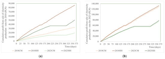 Cumulative profit from the sale of electricity production according to different rates: (a) from 2018, (b) from 2023 (CM—calculations according to the average price on the competitive market, HH—according to the average price for households, the year determines the amount of electricity produced in the hydropower plant at the wastewater treatment plant in Toruń).