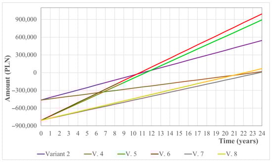 The analysis of the balance of revenues and costs (Figure 8) shows that the investment will pay off, depending on the variant, from 10.75 years after launch (variant 6) to 23.74 years (variant 7), ignoring price changes. The shortest payback period, therefore, concerns electricity production from 2018 at the average selling price of electricity for households in Poland in 2023; the longest was electricity production from 2023 at the average selling price of electricity on the competitive market in Poland in 2023. A significantly shorter payback period was achieved for 2018 production (10.75–11.38) compared to 2023 (22.13–23.74), so the settlement itself according to rates for different types of entities (competitive market: odd variants, households: even variants) and price increases (2018: variants 1–4, 2023: variants 5–6) are of lesser importance.