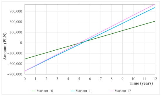 Assuming electricity production for the maximum achieved turbine power in 2018 and 2023 (36.75 kW), i.e., 321,930 kWh, this time could be shortened. The cost comparison for this theoretical example is presented in Table 2 (variant 9: electricity sales rate from 2018 on the competitive market in Poland, variant 10: electricity sales rate from 2018 for households, variant 11: sales rate from 2023 on the competitive market, variant 12: sales rate from 2023 for households). As can be seen, variant 9 is unprofitable, while for 10, 11, and 12, the payback period will be checked.