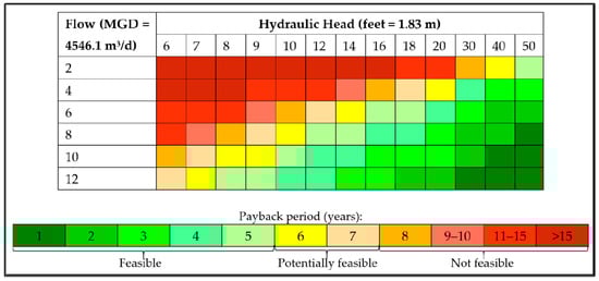 Profitability matrix of a hydropower plant depending on the average daily hydraulic drop and the average daily flow per turbine according to [59]; data for the hydropower plant in Central Wastewater Treatment Plant in Toruń: flow = 11.29 MGD, head = 25.72 feet.
