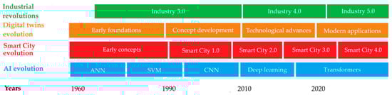The integration of AI in energy optimization for smart cities began with basic rule-based systems that relied on predefined instructions to manage energy distribution and reduce losses. As computing capabilities advanced, machine learning (ML) emerged, enabling systems to analyze historical energy usage data and identify patterns, enabling dynamic and data-driven energy management strategies. Early applications of ML focused on regression models and clustering techniques, optimizing energy demand forecasts and classifying consumption behavior to enable better resource allocation. The evolution of neural networks introduced deep learning (DL), which used multi-layer architectures to process large datasets, increasing the accuracy of energy load forecasting and anomaly detection. Deep learning models, particularly convolutional neural networks (CNNs) and recurrent neural networks (RNNs), improved real-time monitoring and predictive maintenance of energy systems, reducing downtime and inefficiencies. Generative AI models, including variational autoencoders (VAEs) and generative adversarial networks (GANs), have further advanced the field by simulating energy scenarios and optimizing grid resilience under hypothetical conditions. The introduction of transformer architectures has revolutionized AI in smart cities, offering improved capabilities for processing sequential energy data, improving the accuracy of long-term forecasting, and enabling more adaptive energy optimization. Transformers like OpenAI’s GPT have facilitated smarter energy management strategies with natural language processing (NLP)-enabled systems, enabling seamless communication between energy operators and automated decision-making systems. Today, generative AI applications in energy optimization are exploring advanced scenarios such as microgrid optimization, dynamic integration of renewable energy sources, and creating digital twins for comprehensive simulations of energy ecosystems []. Looking ahead, AI algorithms in energy optimization are poised to integrate quantum computing and advanced reinforcement learning, unlocking unprecedented performance and ushering in a new era of energy-smart cities as shown in Figure 1.