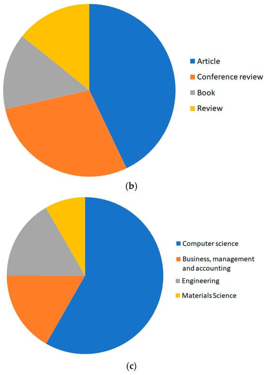 Number of publications decreases with year, as shown in Figure 4a. The dominant form of publication so far has been the article, as shown in Figure 4b, and more than half of the publications fell within the discipline of computer science, as shown in Figure 4c.