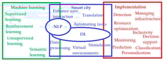 The applications of combining IoT and deep reinforcement learning (DRL) are particularly promising []. An additional problem in the face of the energy crisis is the vertical areas of the smart city with IoT devices with limited energy resources and little possibilities for energy optimization. In case of inability to increase energy efficiency, an intelligent framework based on software-defined wireless networks and edge computing must be applied. From a computational point of view, it is based on the synergistic integration of dual deep reinforcement learning and matching game theory for multi-connectivity and guaranteed service provisioning under radio access constraints. This gives an improvement of 45% in overall energy efficiency []. It is necessary to quickly bridge the gap between the use of traditional energy consumption analysis methods and the use of modern consumption methods using AI, especially DL, which can be cheaper and more efficient in the long run and at a large scale. They can also correct significant limitations in energy consumption and its optimization regardless of industries and application areas []. Energy optimization must take into account a number of constraints. Indicators of occupant comfort (thermal, visual and air quality) can be based on measurements and predictions of parameters (temperature, lighting and CO2).Until now, these were rather static user parameters declared once at the beginning. Currently, the DL-based approach predicts the above-mentioned parameters for a given user based on the Bat algorithm and fuzzy logic, optimizing energy consumption and ensuring user comfort []. This is also possible thanks to fuzzy weather prediction []. The parameters predicted in this way have improved the ease of use of intelligent systems, reduced energy consumption and comfort indicator management. The study of the implementation of a demand-side management (DSM) aggregator model in smart cities in the retail industry regarding energy saving awareness and the application of deep learning techniques showed the high effectiveness of the aggregator model, where the mean square prediction error (MSPE) was below 2.05% []. Recent advances in DL models pave the way for designing efficient energy management schemes. Here, we propose an artificial jellyfish optimization model with deep learning for decision support (AJODL-DSSEM) that performs data preprocessing at the initial stage to normalize the data and a convolutional neural network–bidirectional short-term memory (CNN-ABLSTM) model for energy prediction with an RMSE of 0.384 [].