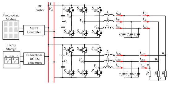 As a solution to the problem of the depletion of traditional energy sources, it is vital to develop renewable energy, such as wind, and photovoltaic energy, and the penetration has been increasing in the Distributed Generation system (DGs) gradually [1]. As the key interface for grid connection, the function of the inverter is very important. Inverters are classified as grid-following inverters and grid-constructing inverters based on whether they are dependent on the grid while operating [2,3]. The main characteristic of a grid-following inverter is that it adjusts and outputs based on grid voltage and frequency. This type of inverter usually requires grid support for stable operation. Unlike the grid-constructing inverters, they can generate the voltage and frequency required by the grid on their own, without relying on voltage signals from the external grid. In practice, these two types of inverters can be operated both individually and in parallel. The parallelled inverters can not only flexibly configure the capacity of the power supply but also improve the stability and fault tolerance of the system. However, the presence of software discrepancies or hardware disparities between parallel inverters can result in a different ZSV in each inverter, hence providing a source of ZSCC [4]. The discrepancies or disparities among a paralleled system will result in a differential ZSV for each inverter. If parallel inverters share the same DC bus, moreover, without isolation transformer on the AC output side, there will be a ZSCC flow path in the parallel inverter system [5]. The generation of ZSCC can lead to excessive Total Harmonic Distortion (THD) of the inverter output current, reduce the efficiency of the inverter parallel system, and increase the power consumption of the IGBTs [6,7,8]. Hence, it is vital to suppress the ZSCC for the stabilization and efficiency of the parallel operation of the inverter.