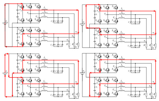 In each inverter there are a total of two switching states for the IGBTs above each phase of the bridge arm, so there are a total of four switching states between the k-phase of the first inverter and the k-phase of the second inverter, including and . The circulation path of the circulating current is thus shown in Figure 2.