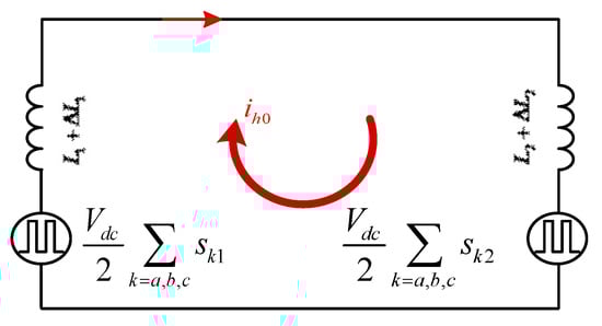 The loop current of inverters 1 and 2 can be defined as the distinction derived from the measured output current of each inverter and the average current of all inverters. According to the definition of loop current, it can be demonstrated that the loop current between inverters 1 and 2 is of equal magnitude and opposite direction. Therefore, Equation (6) be obtained.