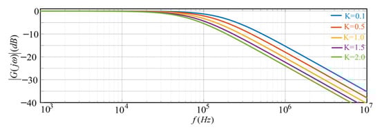 According to Equation (11), the amplitude characteristic of the ZSCC controller at different inductance parameters can be obtained as shown in Figure 4. To illustrate the effect of inductive disturbances on the ZSCC controller, define .