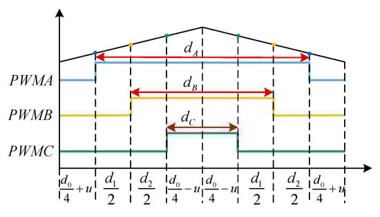 In a switching cycle, the action times of the non-zero vectors are determined as , , and , respectively, and is defined as the Zero Sequence Duty Cycle (ZSDC). Introducing the zero-vector assignment adjustment factor , the configuration of the switching states within a single switching cycle is illustrated in Figure 5.