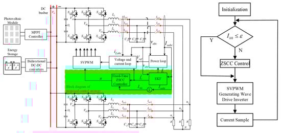 Figure 7 presents the control schematic of the ZSCC suppression strategy adopted in this study for a parallel inverter system. It can be seen that the front stage of the system consists of the PV and the energy storage system, which are jointly linked to a DC bus shared by the inverters in the backstage, and the AC output of the inverters can supply the loads. From Figure 7, it is apparent that based on the traditional inverter control scheme, a ZSCC detection module, a fixed-time ZSCC controller, and an EKF are added. The working principle is as follows: first, the ZSCC and the corrected inductance parameters in the system are detected, then the zero vector assignment factor u is calculated in the fixed-time ZSCC controller, and finally the control signal for the IGBT is generated by the SVPWM module.
