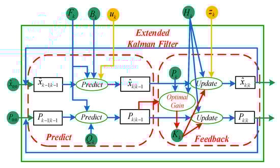 where ; . Through Equation (27), the predicted values of the state variables at this moment and the predicted values of the covariance matrix can be obtained. Therefore, the correction process of the EKF is