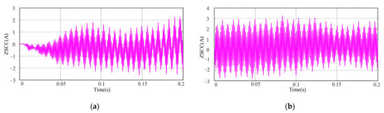 With the same inductance parameters, the conventional control strategy is added to the parallel inverter system at 0.1 s. After 0.05 s, the amplitude of the ZSCC is tremendously reduced, and finally the amplitude of the ZSCC is stabilized within the range of ±0.5 A, as illustrated in Figure 13b. The control strategy presented in this study is injected into the parallel inverter system at 0.1 s, and the ZSCC is quickly suppressed with a small steady-state error, as illustrated in Figure 13a.