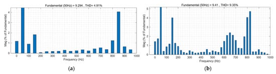 The presence of the ZSCC has a major effect on the power quality of the inverter output, resulting in the distortion of the output current of the parallel inverters. The THD of the first inverter output current is 4.91% and 9.35% in the case of constant inductance parameter and in the case of inductance parameter disturbance, respectively, as indicated in Figure 11a,b.