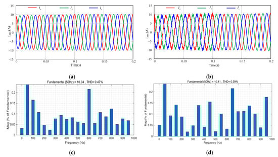 After adding the ZSCC control scheme presented in this study at 0.1 s, the output currents of the first inverter in the case of consistent inductance parameters and in the case of occurrence of inductance parameter perturbation are displayed in Figure 12a,b. From Figure 12, it is observed that after the addition of the ZSCC suppression strategy proposed in this study at 0.1 s, the ZSCC is explicitly suppressed, the THD of the first inverter output current after reaching the steady state is 0.47% and 0.59%, and the harmonic content of each frequency band is obviously suppressed, as displayed in Figure 12c,d.