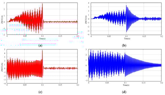 The ZSCC with consistent inductance parameters is depicted in Figure 13a,b, and the ZSCC with perturbed inductance parameters is illustrated in Figure 13c,d.