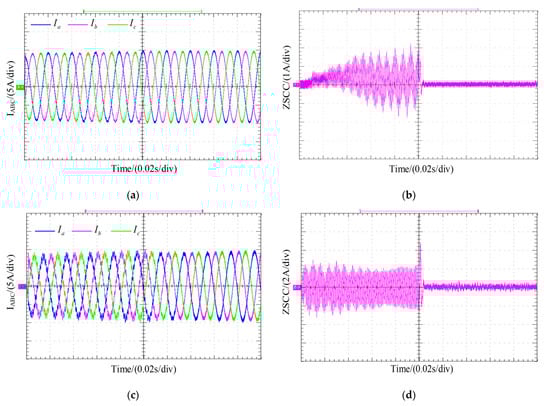 At 0.1 s and 0.15 s, the load is abruptly changed to twice the rated load and the rated load, respectively. The output current of the first inverter changes from the original 10 A to 20 A at 0.1 s and from 20 A to 10 A at 0.15 s, as shown in Figure 16a. During the load switching process, the three-phase current output from the first inverter is not likely to reach the new steady state in an instant, thus causing the change in the ZSCC in the system at 0.1 s and 0.15 s load switching as shown in Figure 16b. However, with the ZSCC suppression strategy proposed in this paper, the ZSCC in the system is quickly suppressed after about half an industrial frequency cycle.
