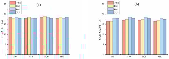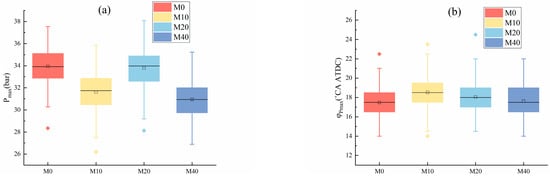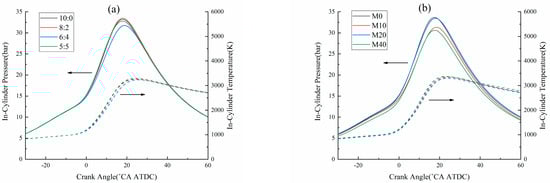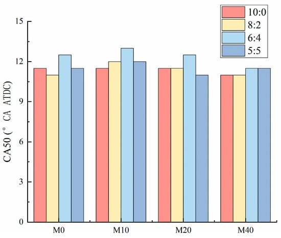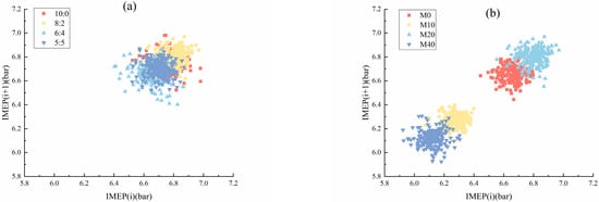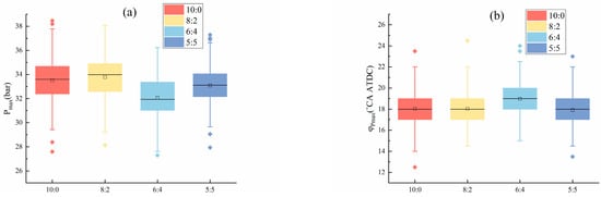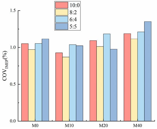 - Adjusting the two-stage injection ratio and methanol blending ratio does not negatively affect the fluctuation of cylinder peak pressure or the corresponding crank angle positions. The coefficient of variation under each condition does not exceed 1.5%. The combination of M20 fuel and the 8:2 two-stage injection strategy ensures optimal combustion stability and larger IMEP values.