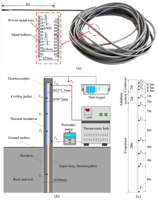 A 32 m-long flexible thermosyphon fabricated with 304 stainless steel, using ammonia as the working fluid, was field tested in this work. It was made up of a smooth pipe (2 m in length) and a corrugated pipe (30 m in length), as depicted in Figure 1a. The smooth pipe was set as the condenser, with an outer and inner diameters of 22 and 19 mm, respectively. The corrugated pipe was inserted into a borehole as the evaporator, while its near-surface part was wrapped by thermally insulated material with a length of 2 m. The outer and inner diameters of corrugated pipe were 25 and 18 mm, respectively. In addition, a 1 mm-thick woven metal wire was wrapped around the outer wall of the corrugated pipe to enhance its mechanical strength. The detailed structure of the corrugated pipe is also illustrated in Figure 1a. The filling ratio of ammonia was 37%, which was defined as the ratio of the liquid ammonia volume to the total volume of the corrugated pipe.