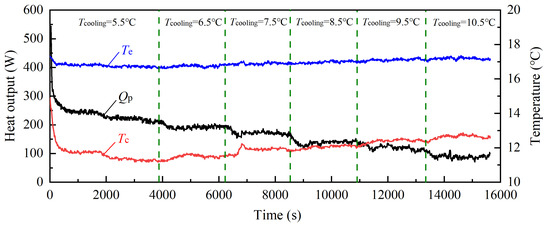 To reveal the steady-state heat transfer characteristics of the STFS, Figure 3 shows the variations of Te, Tc and Qp during the test with the condenser inclination angle set to 0° and a vcooling of 900 mL/min. The initial temperature of the cooling water fed to the shell heat exchanger at the condenser was 5.5 °C, and it was incrementally increased by 1 °C after a semi-steady state was reached. As Figure 3 shows, Te, Tc and Qp all exhibited a sharp reduction at the initial stage of start-up, but they leveled out soon. When Tcooling was 5.5 °C, the practical heat transfer power of the SFTS at the semi-steady state was approximately 230 W, with Te and Tc reaching nearly 13.7 and 11.5 °C, respectively. As Tcooling increased, Qp showed a significant reduction. It decreased to as low as 90 W when Tcooling was 10.5 °C. However, both Te and Tc increased with the increasing Tcooling. Tc increased by 1.2 °C when Tcooling was increased to 10.5 °C, while Te merely increased by 0.4 °C. It implied that the difference between Te and Tc also reduced with an increased Tcooling. The above discussion revealed that the heat transfer power of the SFTS and the temperature difference between the evaporator and condenser Te–Tc at a steady state are linearly related. Moreover, the slight temperature increase of Te observed in the test suggested that the heat extraction rate from underground was below the maximum heat recovery rate around the borehole.
