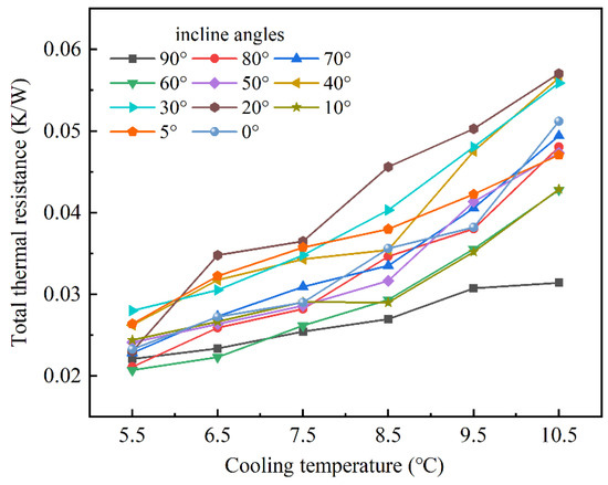 Previous studies have demonstrated that the heat transfer limit of a geothermal thermosyphon decreases significantly when its condenser is bent away from the vertical position [20]. However, the heat transfer power of the SFTS in this work remained well below its heat transfer limit. Consequently, the effects of inclination angle on the heat transfer performance at the steady state was investigated. Figure 4 shows the experimental results of the total thermal resistance Rt under varying Tcooling and inclination angles. It is shown in Figure 4 that the increase of Tcooling increased Rt extremely, implying a degradation in the overall heat transfer performance of the SFTS with an increase in Tcooling. Furthermore, as Figure 4 shows, the inclination angle had an insignificant influence on Rt at a lower Tcooling. When Tcooling was below 6.5 °C, Rt ranged from 0.02 to 0.03 K/W, with the lowest Rt observed at an inclination angle of 60°. However, as the inclination angle exceeded 60°, Rt increased, likely due to an increase in the shearing force of the two-phase flow at higher heat transfer power. Additionally, as Tcooling increased above 6.5 °C, the impact of inclination angle on Rt became more pronounced. At a Tcooling of 10.5 °C, the lowest Rt was approximately 0.031 K/W at an inclination angle of 90°, while the highest Rt was approximately 0.057 K/W at an inclination angle of 20°.