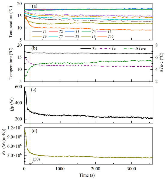 In addition, a comparison of Figure 5b,d reveals that when Kt began to become stable at about 150 s, the temperature difference between Te and Tc also nearly reached a turning point. This observation suggested that the operation state of the SFTS during start-up could be roughly judged by ΔTe–c, namely Te–Tc, which can serve as a valuable parameter for modeling the dynamic heat transfer process in the SFTS.