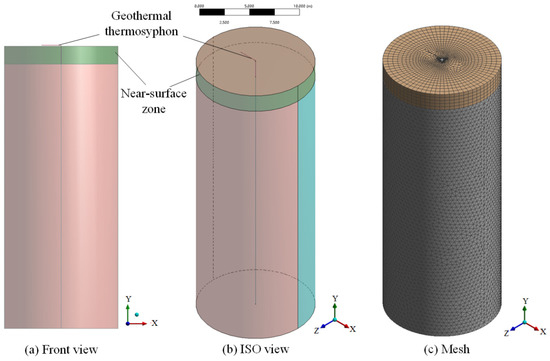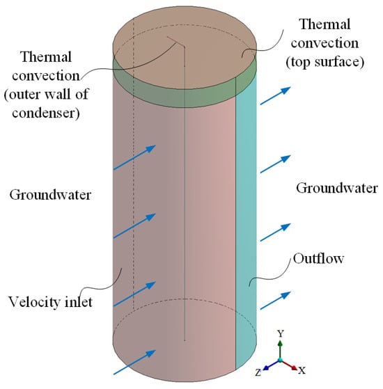 We built a full-scale 3D computational geometry for the CFD simulation of the SFTS using the Design Modeler of ANSYS 19.0, as shown in Figure 7. The underground soil zone was a cylinder with a radius of 6 m and a depth of 30 m. The soil in the near-surface zone was treated as a homogeneous solid body, while the soil zone at depths of more than 2 m was assumed as homogeneous porous media to consider the influence of groundwater advection. The full-scale SFTS was also treated as a solid body coupled with the soil zones through the boundary conditions of coupled interfaces.