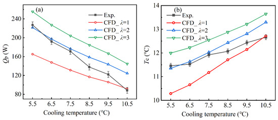 Figure 9 shows the comparison between the experimental and simulation results at a steady state with Tcooling varying from 5.5 to 10.5 °C. The variation of practical heat transfer power Qp is plotted in Figure 9a. As Figure 9a shows, the predicted trend of Qp with Tcooling for different λ values closely aligned with the experimental results. However, Qp was overpredicted when λ was set to 3. For Tcooling in the range of 5.5 to 7.5 °C, the CFD predictions of Qp were in good agreement with the experimental data when λ was specified as 2, while, for a higher Tcooling, λ equal to 1 showed better prediction accuracy. In addition, Figure 9b compares the experimental and simulation results for the condenser temperature Tc. The variation trend of Tc with Tcooling was opposite to that of Qp, but the prediction accuracy for various λ values was similar to that of Qp. In most shallow-geothermal applications, an SFTS is operated at a low temperature at the condenser, typically near 5 °C for space heating and even lower for pavement de-icing. It is thus recommended that the empirical coefficient λ take 2.