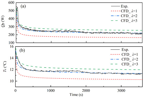 The experimental and simulated variations of Qp and Tc during the start-up are shown in Figure 10 under the conditions where Tcooling was controlled at 5.5 °C. As Figure 10 shows, in the initial 250 s, the variations of Qp and Tc for various values of λ were not well consistent with the experimental results. This is due to the fact that the simplification assumptions made for the SFTS neglected the inner phase change and flow circulation dynamics, treating the equivalent thermal conductivity in the SFTS as a constant. However, when the simulation time was longer than 250 s, the predictions of Qp and Tc showed good agreement with the experimental variations for λ, which was equal to 2. These findings indicate that the dynamic heat transfer modeling method developed for the SFTS in shallow geothermal applications is reliable and effective for capturing steady-state behavior.