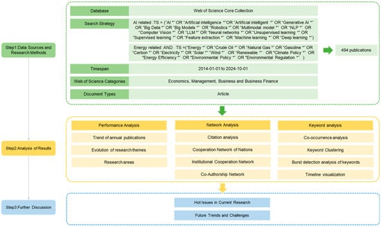 The aim of this paper is to provide a comprehensive bibliometric analysis of energy economics research and artificial intelligence. First, relevant literature was searched for in the appropriate databases according to the search strategy [45]. Next, the performance was analyzed in terms of annual publication trends, disciplinary distribution, and research areas. Then, citations, regions, institutions, and authors were studied through CiteSpace bibliometric methods and tools. Meanwhile, hotspots, future trends, and challenges in these research areas were identified. The research framework of the methodology of this paper is shown in Figure 2.