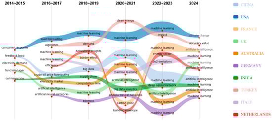 Figure 4 illustrates the evolution of research themes in the publications of the top ten countries, highlighting a clear homogenizing trend of strong continued focus on machine learning and AI across countries. Between 2014 and 2015, research efforts in pioneering countries such as China, the United States, the United Kingdom, Australia, and India focused on energy efficiency and energy forecasting, which relied on third-party forecasting and employed time-series analysis. This reflects a shift in research methodology toward learning algorithms and an increasing reliance on the data themselves rather than the variables of interest for forecasting.