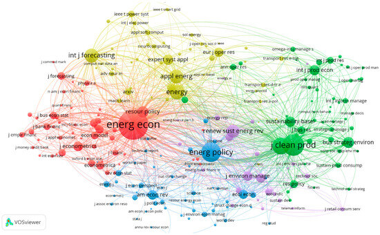 The purple cluster relates to renewable energy and its integration into energy systems, highlighting the importance of sustainable energy solutions. The yellow cluster focuses on the application of energy in various fields, including smart grids, energy management systems, and photovoltaic power generation, emphasizing the practical utility of energy use, with strong links to the field of engineering. The red cluster covers the fields of economics, finance, and management, with special emphasis on energy economics, energy policy, and energy finance. The blue cluster is dedicated to energy policy, reflecting the role of governance and regulatory frameworks in guiding the energy sector toward sustainable development and efficiency. Finally, the green cluster represents the cross-cutting areas of manufacturing, production systems management, and the development of green production materials, demonstrating efforts to improve the sustainability of industrial processes. As illustrated in Figure 6, each node symbolizes a journal, and a link between two nodes indicates that both journals appear in the same publication. The size of the node reflects the frequency of the appearance. This means that the larger the node, the more frequently the journal appeared. In contrast, the width of the links indicates the number of times the two journals appear together. In particular, in Figure 6, the nodes clustered in red are not only the largest but also have the most links, revealing a strong correlation between different research topics. This suggests that energy economics research is deeply cross-studied and rich in academic interactions with other subject areas, such as energy policy, energy applications, and renewable energy. The green engineering technology cluster is relatively independent, which implies a certain degree of research isolation in the field. Cross-research between the energy economics research and engineering technology clusters has not yet reached the desired depth, indicating that more interdisciplinary collaboration may be needed in order to promote knowledge integration and innovation.