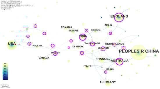 The number of publications directly reflects a country’s academic impact on a particular research topic. Therefore, the types of nodes in CiteSpace are selected based on the concept of “country”.