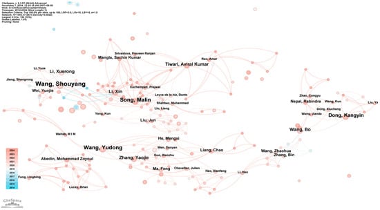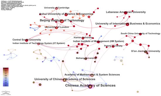 A collaborative network analysis of the literature’s issuing institutions yields Figure 8. The institutions with the highest number of articles in AI&EE are the Chinese Academy of Sciences and the Beijing Institute of Technology, with 17 and 11 articles, respectively. Other institutions with eight or more articles are the University of Chinese Academy of Sciences, Lebanese American University, Anhui University of Finance & Economics, and the University of International Business & Economics.