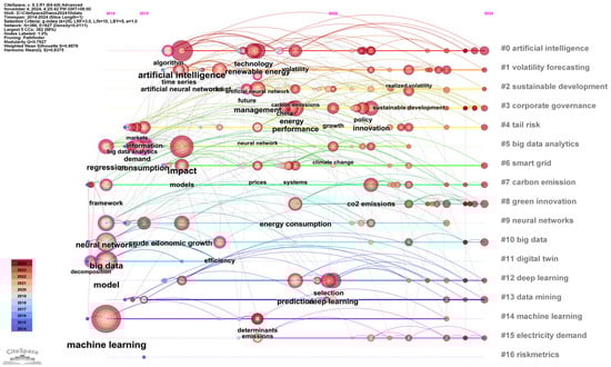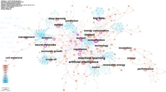 Table 3 lists the titles of the top 10 cited publications and their related information. The table is arranged in ascending order of citations. The co-citation analysis of the literature shows that a total of three articles possess the highest citation rate in the study of AI in energy economics. Among them, the most cited and earliest published document is the publication titled “Does energy diversification cause an economic slowdown? Evidence from a newly constructed energy”. Gozgor et al. analyzed the differences in the impact of energy diversification on economic growth by constructing a new energy diversification index using the nonlinear panel autoregressive distributed lag (NPARDL) method, and found that energy diversification has a positive effect on growth in major economies in the long run, but in the short run, it has a positive effect on growth for some countries and a negative impact in all low-income economies [46]. Lau et al. published in 2023 the article titled “Introducing a new measure of energy transition: Green quality of energy mix and its impact on CO2 emissions”, which has a high citation frequency and has co-citation relationships with several articles [47]. The article adopts a new measure of energy transition, the green quality of energy mix (GREENQ), and uses systematic GMM, FGLS, and PCSE panel data techniques to examine the impact of per capita income, institutional quality, and technology in 36 OECD countries on the emissions of CO2 from 1970–2021.