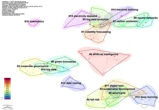 Bibliometric methods have been applied in the field of AI and energy research for keyword clustering and the analysis of research themes and research trends. In the area of engineering and technology, Iorgovan conducted a bibliometric analysis of AI and renewable energy utilization [14]. Zhang et al. conducted a bibliometric analysis and scientific mapping of AI in the field of renewable energy utilization using VOSviewer1.6.15, CiteSpace5.8.R3, and Bibliometrix4.1.1 to investigate the application of AI in the field of renewable energy [29]. Hou et al. used bibliometrics to explore the application of big data and artificial intelligence in the energy field [30]. Olu-Ajayi et al. discussed the use of statistical and artificial intelligence tools in building energy prediction [31]. In the field of energy economics and finance, Mardani et al. provided an overview of the application of DEA modeling in the field of environmental and energy economics [32], and Wang et al. examined energy policies related to green finance [33]. Singhania et al. provided a comprehensive review of the evolution of sustainable finance research and future research directions by analyzing overall publication trends, co-authorship networks, and journal co-citations, and performing by cluster analysis [34]. Qin et al. used Bibliometrix4.3.0 to analyze the characteristics of research in the field of artificial intelligence and economic development [35]. Gao et al. reviewed the application of machine learning in business and finance, discussing the application of ML in energy marketing [36].