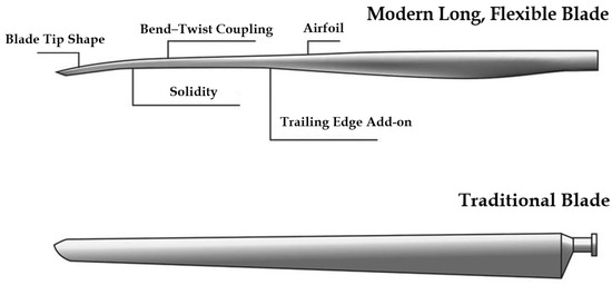 The blade design involves both aerodynamic and structural modules. The aerodynamic module aims to achieve optimal aerodynamic performance through (1) the design and selection of airfoils specifically for wind turbines and (2) the design of aerodynamic shape parameters, such as chord length and twist angle. The structural module focuses on ensuring mechanical integrity by (1) selecting appropriate blade materials and (2) designing sectional configurations, including the placement of the spar cap and the thickness of the skin. A complete blade design must integrate both aerodynamic and structural considerations, making it essential to effectively couple these two modules. The coupling of aerodynamic and structural modules leads to aeroelastic issues, where an elastic structure interacts with the surrounding fluid in a continuous feedback loop. The fluid exerts forces on the elastic structure, causing deformation, which, in turn, affects the fluid domain. This mutual influence makes aeroelasticity a complex phenomenon. In engineering practice, an iterative blade design approach, known as the “aerodynamic design–structural design–load calculation–structural verification” cycle, is commonly used to consider the impact of aeroelastic effects and is referred to as the sequential design method. To improve design efficiency and reduce the reliance on design experience, an integrated design method—determining design parameters based on target performance while closely integrating aerodynamic and structural designs—has also gained increasing attention. Additionally, performance calculation serves as the foundation for blade design. Given a design scheme, the performance parameters are calculated and evaluated. These calculation results then guide adjustments and iterations in the design process, ensuring both the economic viability and safety of the blade. The comparison between a modern blade and traditional blade is shown in Figure 1.