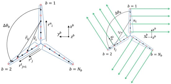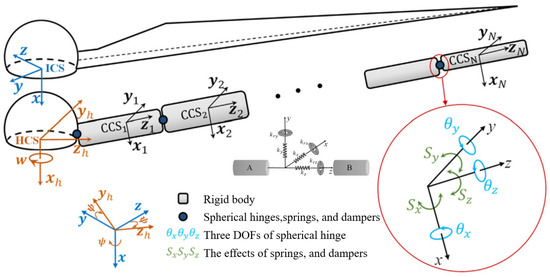 The multibody dynamics (MBD) method is an analytical approach used to study the dynamic behaviors of systems composed of multiple connected rigid or flexible bodies. It is suitable for modeling the entire wind turbine system. Compared to the modal analysis method, MBD reduces constraints on deformation at different spanwise positions of the blade, allowing for more degrees of freedom. However, it cannot provide detailed deformation information for the blade. MBD offers higher computational accuracy and moderate computational time compared to modal analysis. Xu, J. et al. used a rigid multibody dynamics method (Figure 7) to analyze the aeroelastic BaMB model [54]. Horcas, S.G. et al. conducted a numerical simulation study of vibration based on the multibody finite element method [55]. Tang, D. et al. derived system control equations for aeroelastic effects using the multibody dynamics method and the free vortex wake method and proposed a quasi-Newton method suitable for contemporary searches to solve these nonlinear equations based on the inverse BFGS method [56].