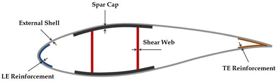 Structural modeling and analysis of wind turbine blades require determining the mechanical properties of each section. The process begins with material selection, followed by defining the structural form and laminate design, and, finally, calculating the sectional properties. For material selection, early designs used aluminum or balsa wood. With advancements in materials, glass fiber-reinforced composites are predominantly used for onshore turbines, while carbon fiber composites, due to their high strength, high modulus, heat resistance, low density, and acceptable cost, are increasingly used in large offshore turbines. In terms of structural form, the mainstream approach involves a main spar/double-web/skin configuration, but other forms, such as double spar double web, box beam, leading-edge reinforcement, and trailing-edge bonding beam, are also used. The typical configuration of the blade section is shown in Figure 5.