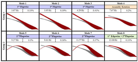 Zheng, Y.Q. et al. analyzed blade vibrations using the modal analysis method, showing that the first six modes are primarily flap modes, and investigated the relationship between tip deformation and load distribution [50]. Chen, Y.C. et al. conducted a comprehensive experimental and numerical study on complex curvature modal shapes and modal coupling dynamics (Figure 6) through triple-modal tests and related FEM simulations [51]. Maktouf, R. et al. performed modal and nonlinear dynamic analyses to study the influence of rotational speed on blade natural frequencies and displacements, proposing an improved finite element formulation based on uncoupled translational and rotational kinetic energy. The results indicated that as the angular speed increased, both the natural frequency and displacement also increased, and the vibration characteristics were significantly sensitive to geometric nonlinearity [52]. Gozcu, O. et al. investigated the capability of modal shapes to represent large deformations, finding that while linear modal shapes could accurately represent flapwise and edgewise deflections, they were insufficient in capturing axial and torsional deflections [53].