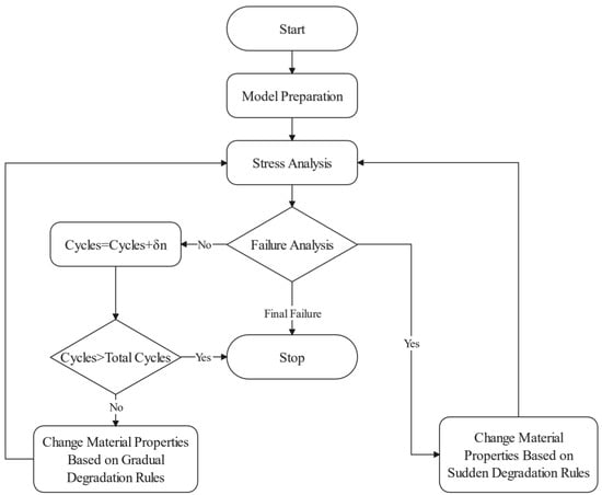 The blade operates in a constantly changing wind environment, bearing long-term, unsteady cyclic loads. According to the classical Miner’s linear cumulative damage theory, when the damage from different load cycles accumulates to a certain extent, fatigue failure occurs, seriously affecting the service life of the blade. In the book “On the Fatigue Analysis of Wind Turbines”, Sutherland, H.J. comprehensively introduces the damage mechanisms, damage sources, damage assessment, and solutions for wind turbine fatigue [62]. Shokrieh, M.M. et al. developed the stiffness degradation method as an alternative to Miner’s linear cumulative damage theory (Figure 8), which can simulate load sequences and load history [63]. Marin, J. et al. analyzed the causes of failure based on damage inspection data [64], while Kong, C. et al. presented a specific fatigue analysis process and conducted practical blade fatigue assessment, providing valuable insights [65].