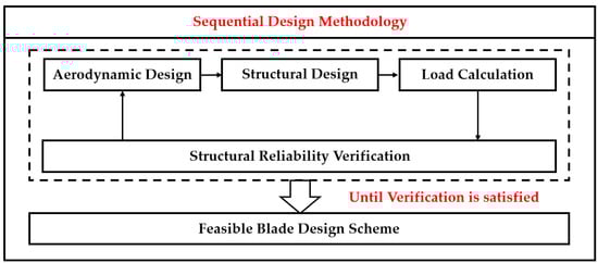 Sequential design involves alternating between aerodynamic and structural design stages, with each subsequent stage adjusted based on the results of the previous one. This process results in delayed interactions between aerodynamic and structural parameters, leading to a longer design cycle. Typically, the aerodynamic design stage employs classical aerodynamic models, deriving analytical solutions for the blade’s aerodynamic shape based on the Blade Element Momentum (BEM) theory. The structural design stage then uses classical beam theory and laminated composite plate theory to perform material selection, design the structural form, and outline the ply layout for the blade. Aerodynamic and structural parameters are calculated, verified, and iteratively adjusted until all constraints are met. The flow of sequential blade design methodology is shown in Figure 9.
