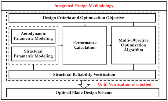 Integrated design, also known as aero-structural integrated design, involves simultaneous parametric modeling of the blade’s aerodynamic shape and structural configuration, enabling concurrent aerodynamic and structural design. This approach allows for real-time interactions between aerodynamic and structural parameters, resulting in a shorter design cycle. Typically, parametric modeling is performed for both aerodynamic shape and structural ply layout, followed by aerodynamic and structural calculations to obtain the blade performance parameters. A multi-objective optimization design method is then used to coordinate and optimize numerous variables and constraints, progressively moving towards the optimal design. Due to its high design flexibility, shorter design cycle, and reduced reliance on experience, strongly coupled multi-objective, aero-structural optimization design has become a current research focus in blade optimization design. Coupled aero-structural, multi-objective optimization design simultaneously considers the optimization of both aerodynamic and structural domains. This approach incorporates diverse and practical design philosophies with fewer restrictions, addressing aerodynamic and structural optimization goals, as well as more integrated economic indicators. The constraints are comprehensive, resulting in an optimal design solution with higher quality and greater engineering application value. However, coupled aero-structural, multi-objective optimization also faces numerous challenges, such as the computational cost skyrocketing due to the large number of design variables, difficulties in meeting the convergence and robustness requirements of optimization algorithms, and challenges in effectively balancing and coordinating multiple cross-domain optimization objectives. The flow of integrated blade design methodology is shown in Figure 10.
