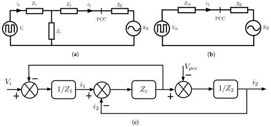 where , , and are the equivalent inverter-side, grid-side, capacitor branch and grid impedances, respectively; and are the inverter-side inductor and equivalent series resistor; and are the grid-side inductor and equivalent series resistor; and are the capacitance of the filter and the series damping resistor; and are the grid inductor and resistor; and are the filter input voltage and Thévenin equivalent grid voltage; and are the Thévenin equivalent voltage and impedance of filter, respectively, as expressed in the following equations.