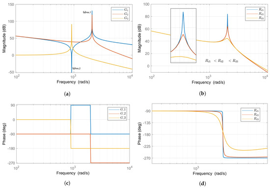 Transfer functions plot and damping resistor impact on resonance: (a) magnitude plot of , , and ; (b) impact of damping resistor on resonance peak of ; (c) phase angle plot of , , and ; and (d) damping resistor impact on phase angles of .