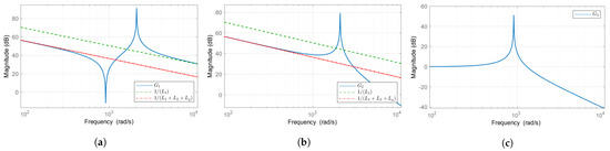 Bode plots of , , and are presented in Figure 2, where two resonant frequencies can be identified for . The common denominator of and resulting in a common resonant frequency () at the frequency given by (8). In addition, a dip can be identified in at which is given in (9).