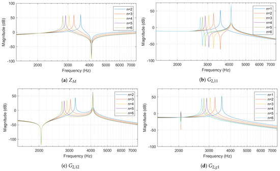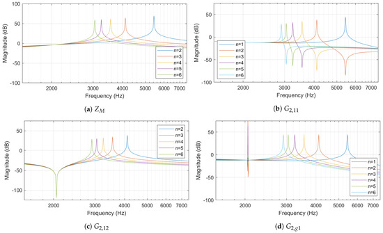 - The frequency response of is depicted in Figure 6b, which represents the diagonal elements of the . Only one resonance point can be seen where resonant frequencies are calculated using (15). The resonance peak decreases as n increases. In addition to the peak, a dip can also be identified, which corresponds to the maximum impedance seen by the inverter in Figure 6a.