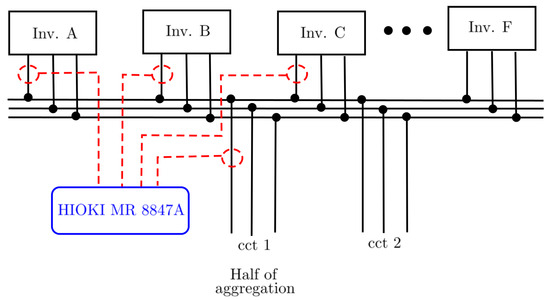 This section provides the on-site measurements to identify the resonance phenomenon associated with solar PV inverters. Theoretical analysis carried out in Section 3 considering only the passive filter components. The advanced controlling techniques implemented by inverter manufacturers have not been considered. A multiple PV inverter system with six identical 20 kW inverters (labelled A–F) was monitored to identify the resonance phenomenon with measurements. The total power output is fed into the grid through two separate circuits. A Hioki MR8847A Memory HiCorder device recorded individual inverter current waveforms and the combined current with high-frequency current clamps. Due to the limitation of the device, only four channels, one phase from inverters A, B, and C, and one circuit of the aggregation circuit were measured. The measurement setup is illustrated in Figure 7.