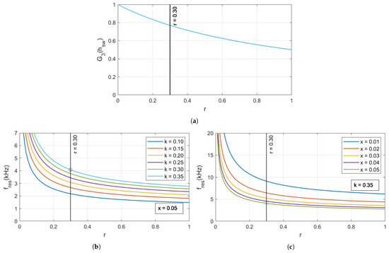 Variation of (a) ripple current attenuation at switching frequency; (b) resonant frequency keeping ; and (c) resonant frequency keeping , against index r.